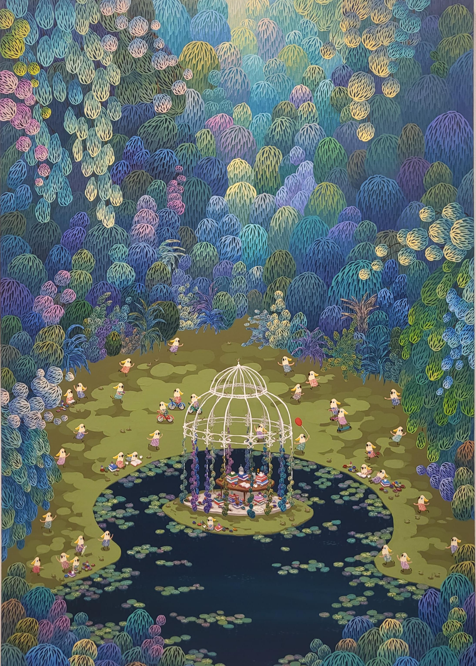 진영 작가의 앵무새 숲은 현대 사회의 특징과 문제를 독특하고 풍부한 상상력으로 그려낸 작품입니다. 앵무새 한 마리가 손전등을 들고 무언가를 찾고 다니는 모습은 현대인들의 모방과 반복을 상징적으로 담아냅니다.